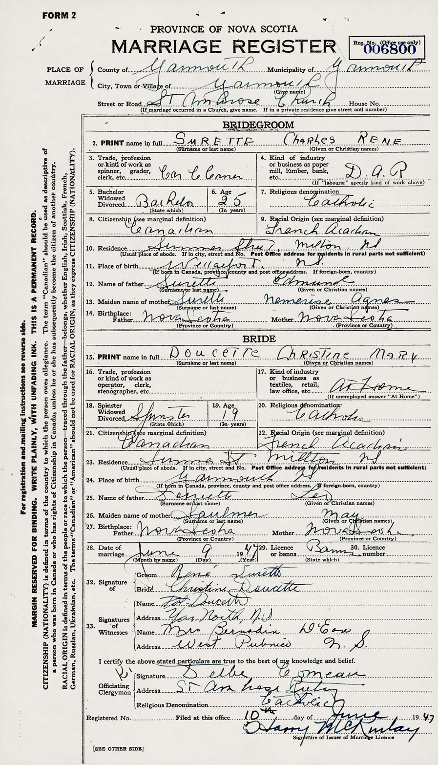28. Date of marriage June 9 1947 29. By license or banns License 30. License number
