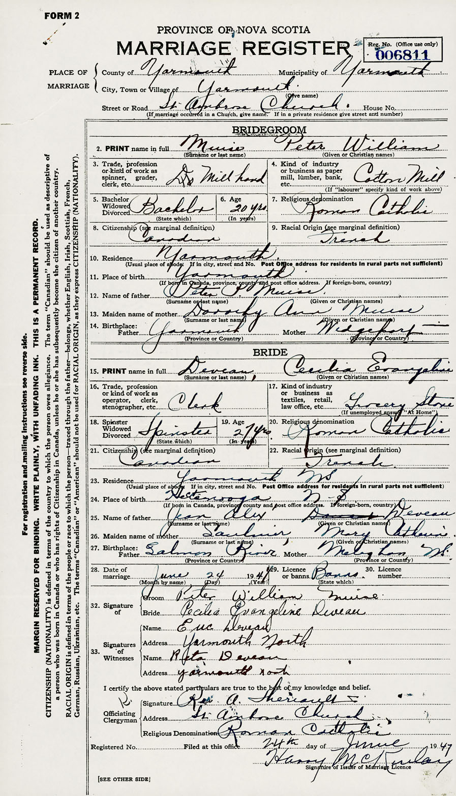 28. Date of marriage June 24 1947 29. By license or banns License 30. License number
