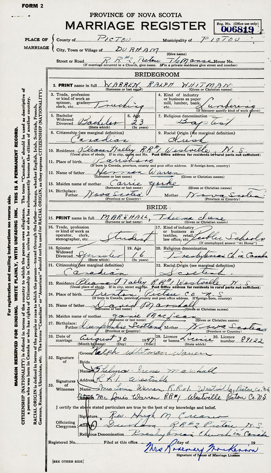 PLACE OF MARRIAGE County of Pictou