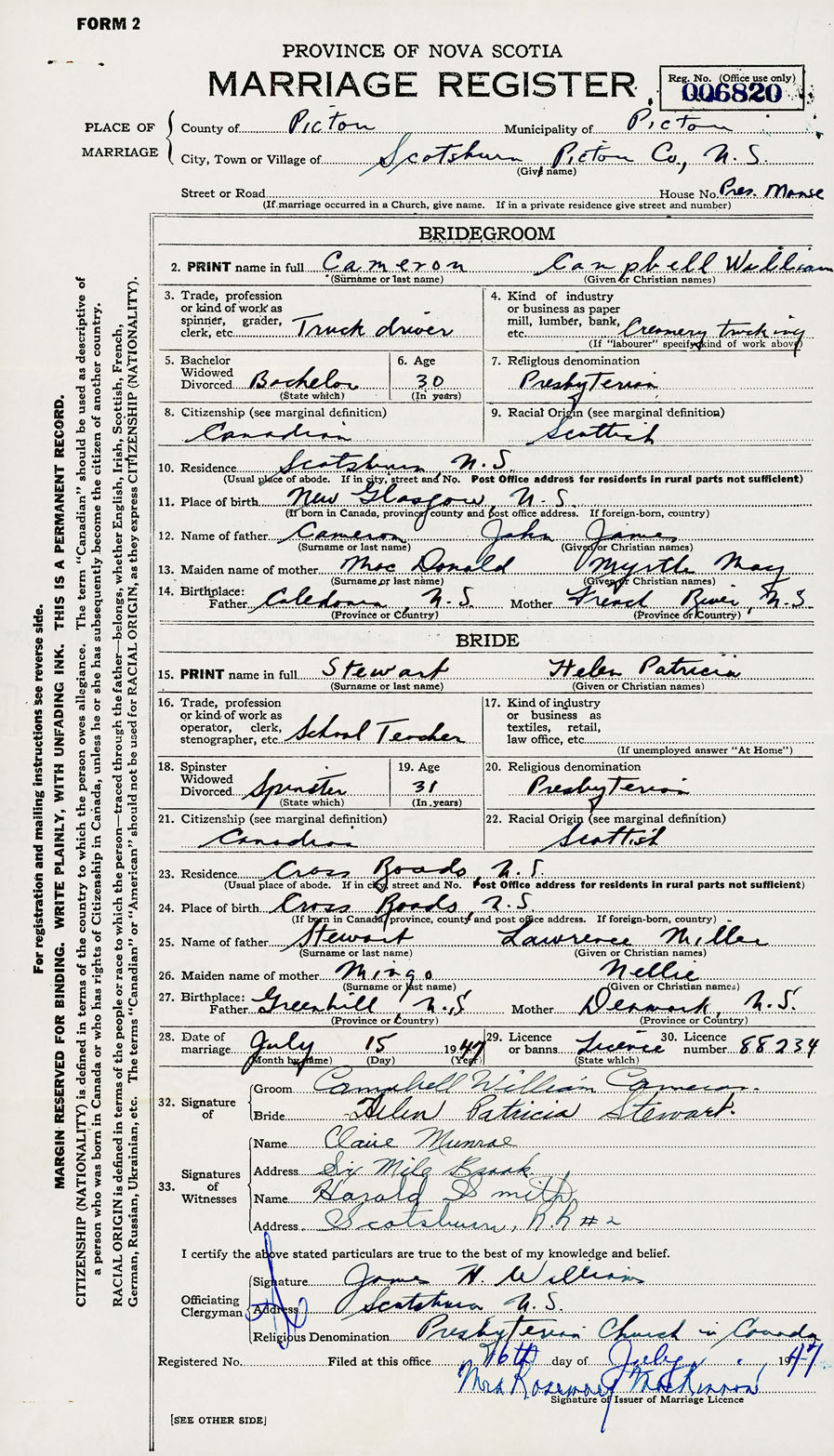 28. Date of marriage July 15 1947 29. By license or banns License 30. License number 88234