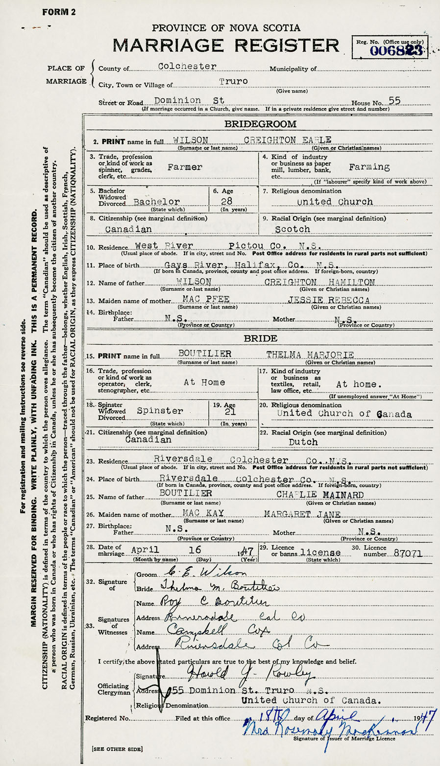 28. Date of marriage April 16 1947 29. By license or banns License 30. License number 87071