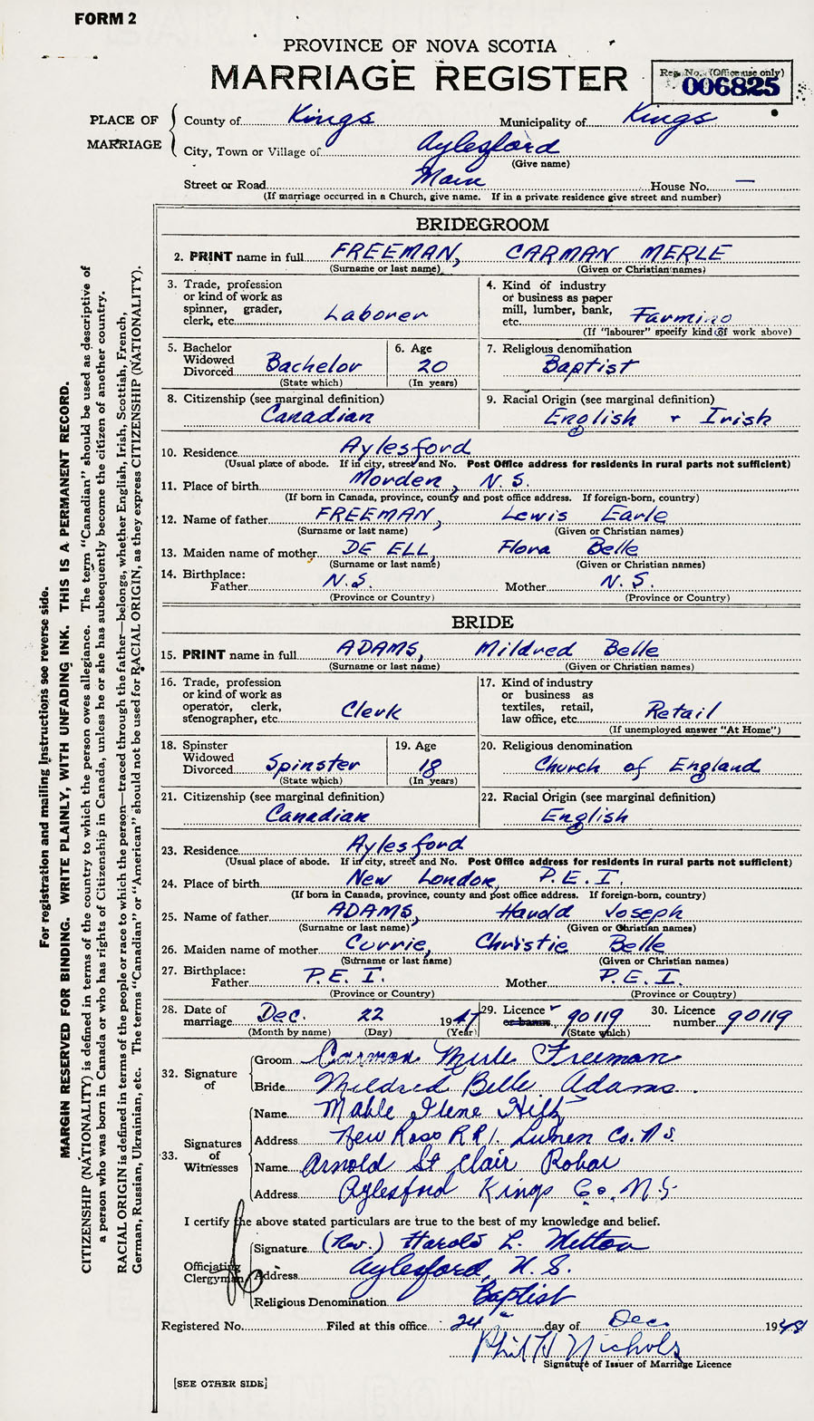 28. Date of marriage December 22 1947 29. By license or banns License 30. License number 90119