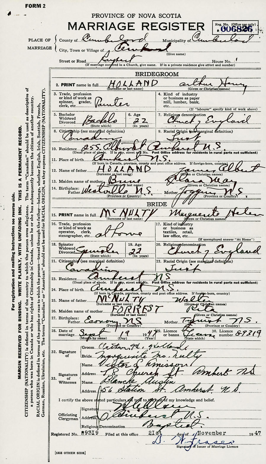28. Date of marriage September 19 1947 29. By license or banns License 30. License number 89319