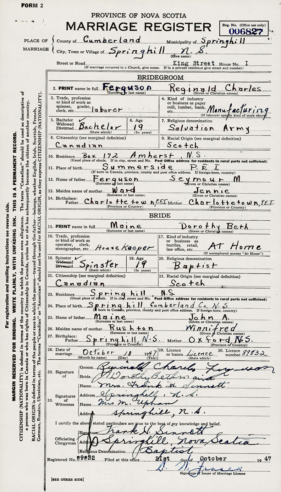 28. Date of marriage October 18 1947 29. By license or banns License 30. License number 89832
