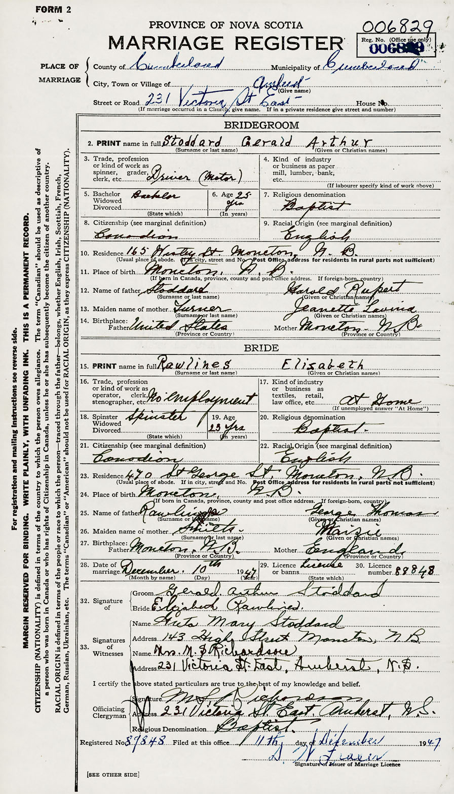 28. Date of marriage December 10 1947 29. By license or banns License 30. License number 88848
