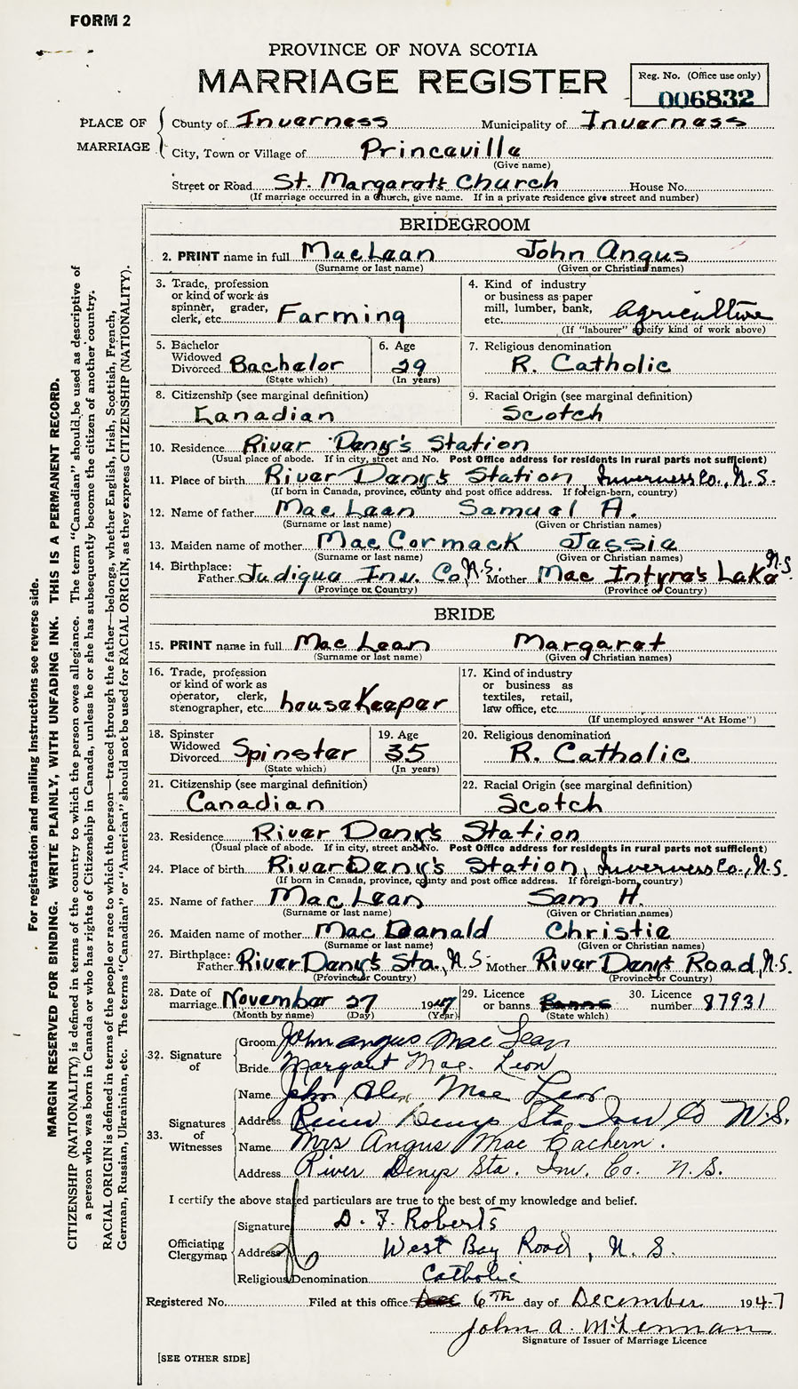 24. Place of birth River Deny’s Station, Inverness County, Nova Scotia