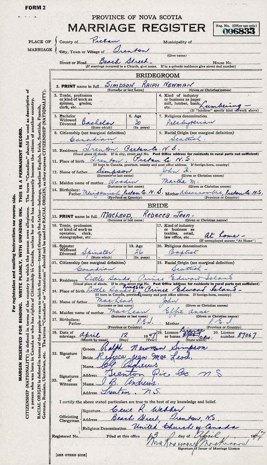 28. Date of marriage April 12 1947 29. By license or banns License 30. License number 87067