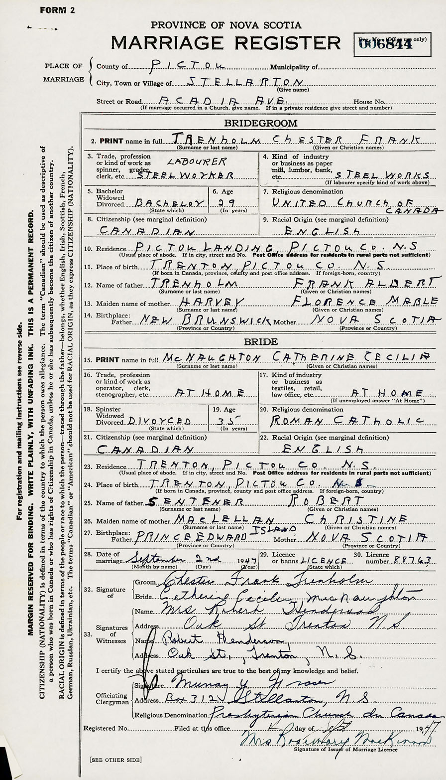24. Place of birth Trenton, Pictou County, Nova Scotia