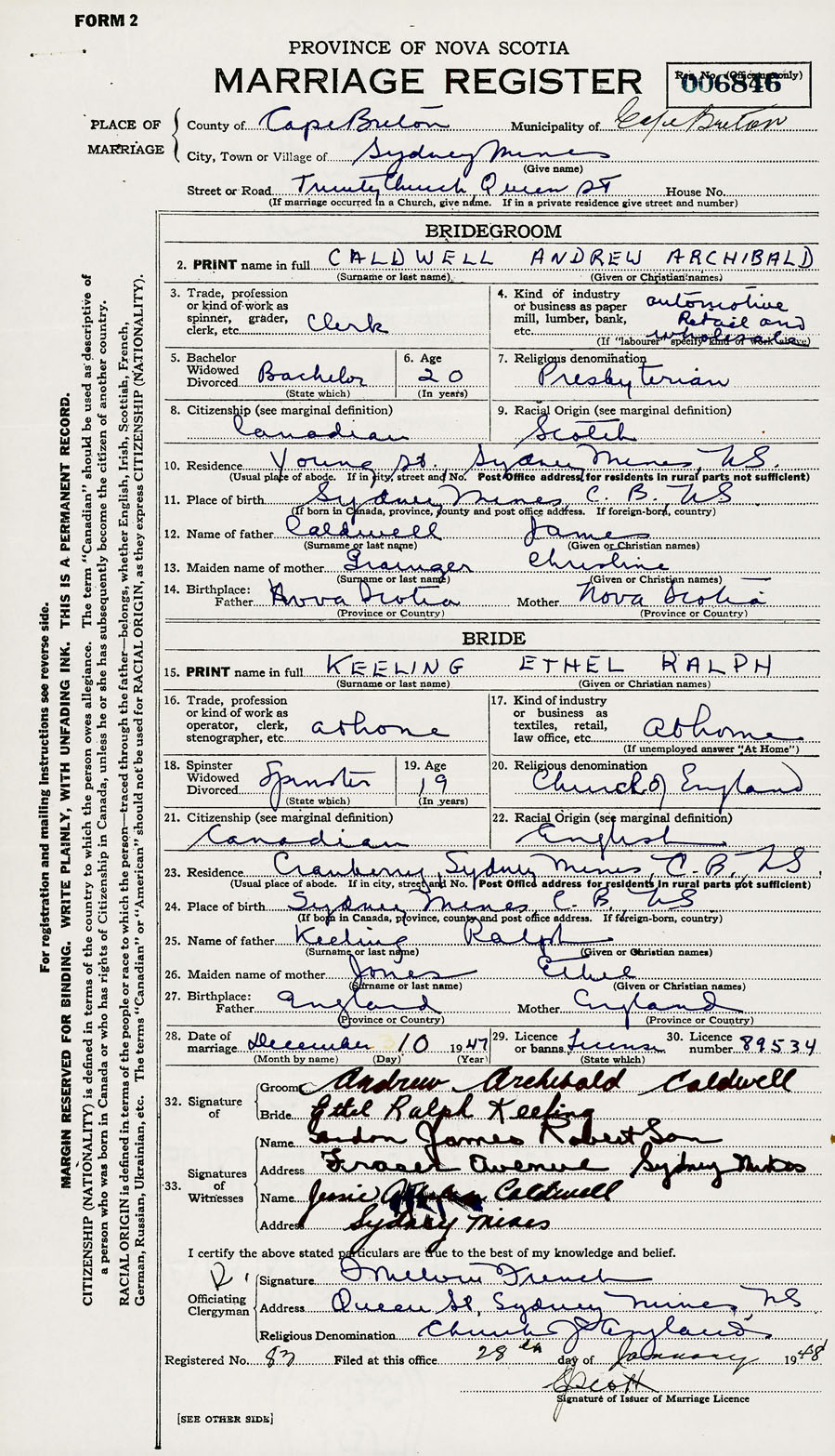 28. Date of marriage December 10 1947 29. By license or banns License 30. License number 89534