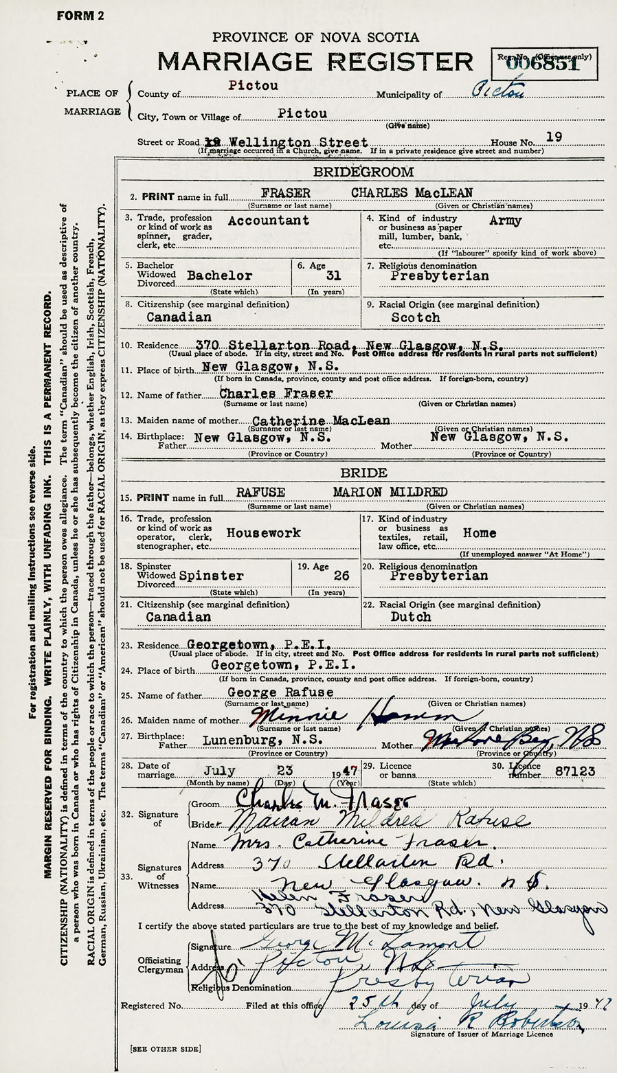 28. Date of marriage July 23 1947 29. By license or banns License 30. License number 87123