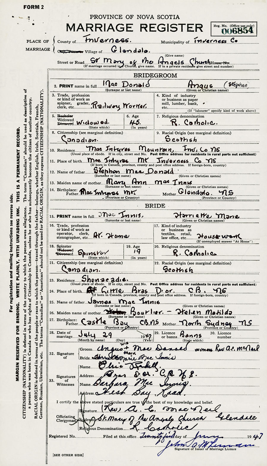 11. Place of birth MacIntyre Mountain, Inverness County, Nova Scotia