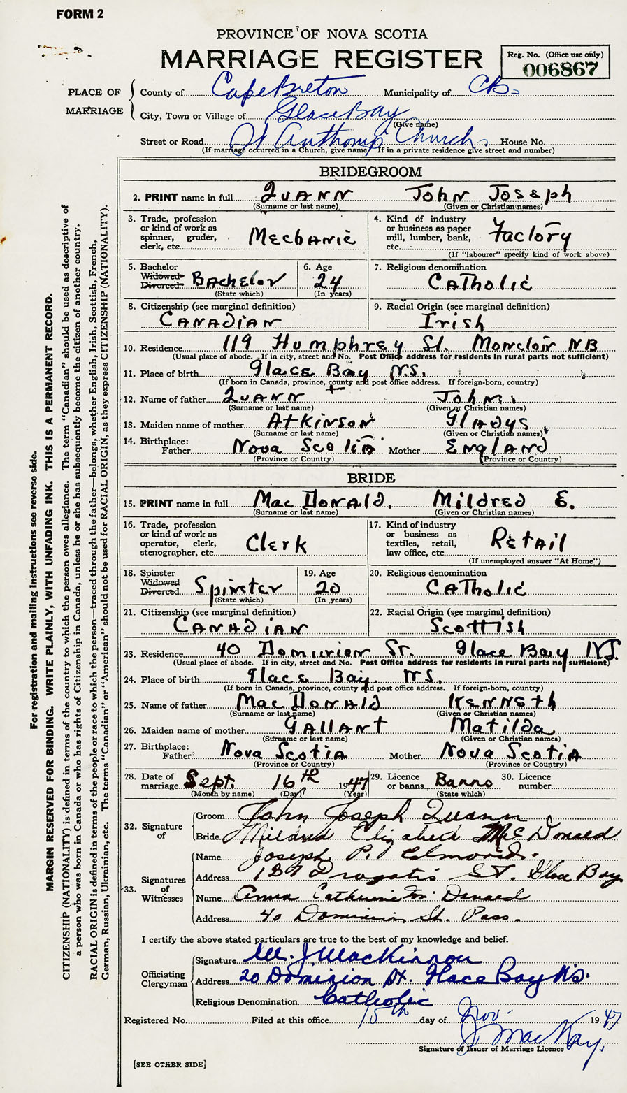 28. Date of marriage September 16 1947 29. By license or banns License 30. License number