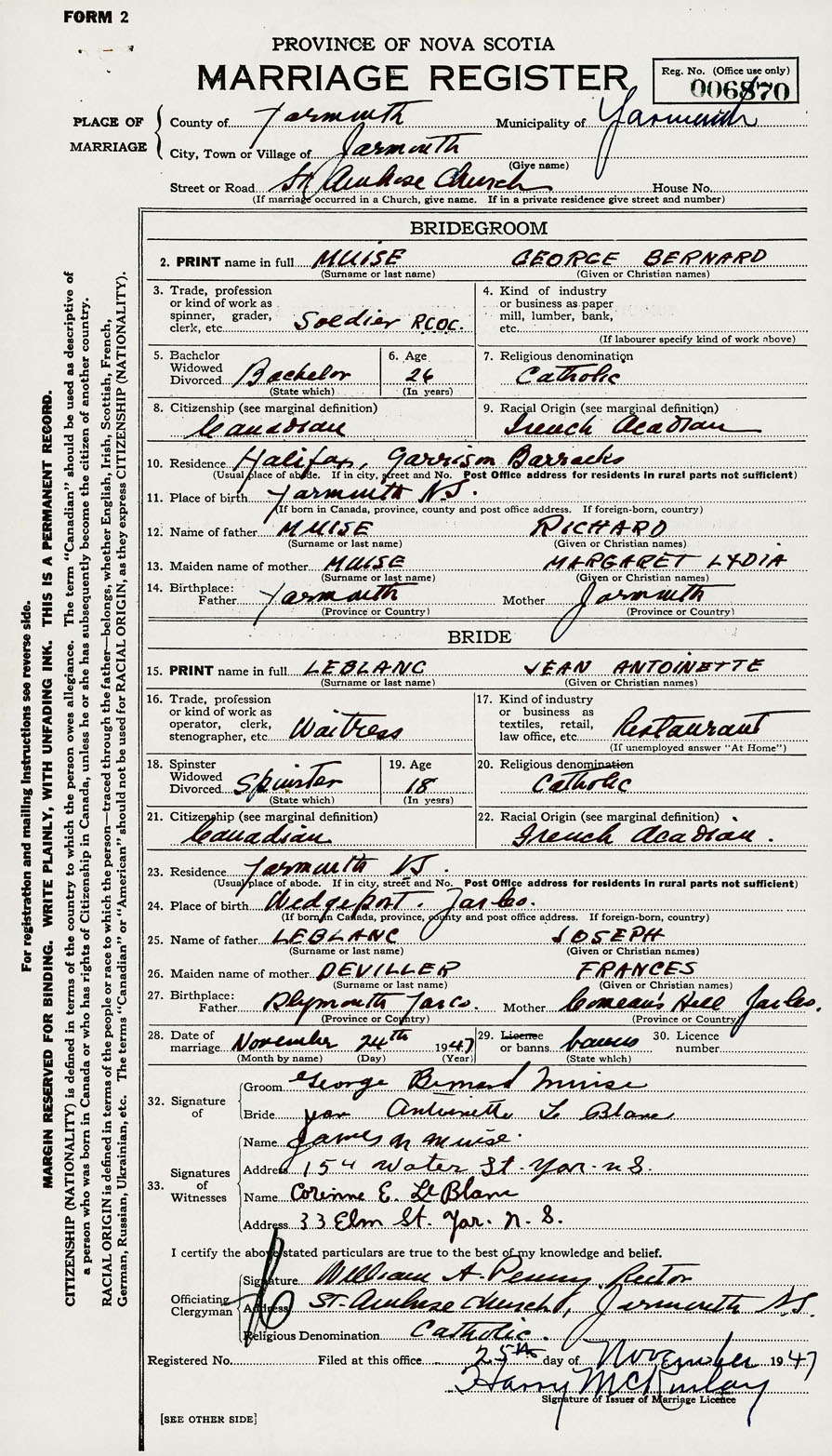 28. Date of marriage November 24 1947 29. By license or banns License 30. License number