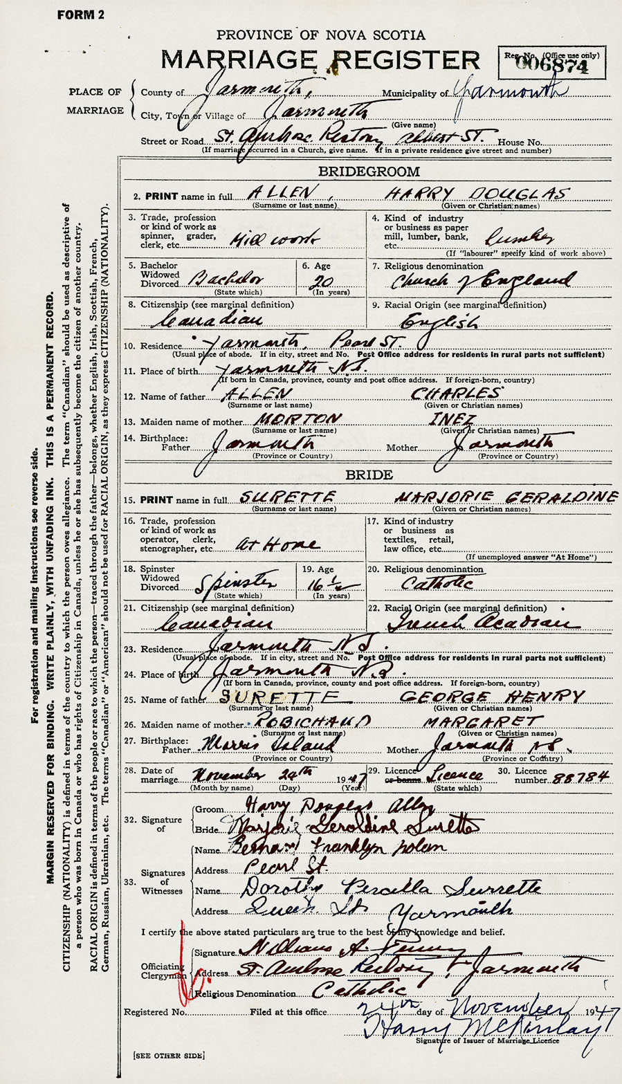 28. Date of marriage November 24 1947 29. By license or banns License 30. License number 88784