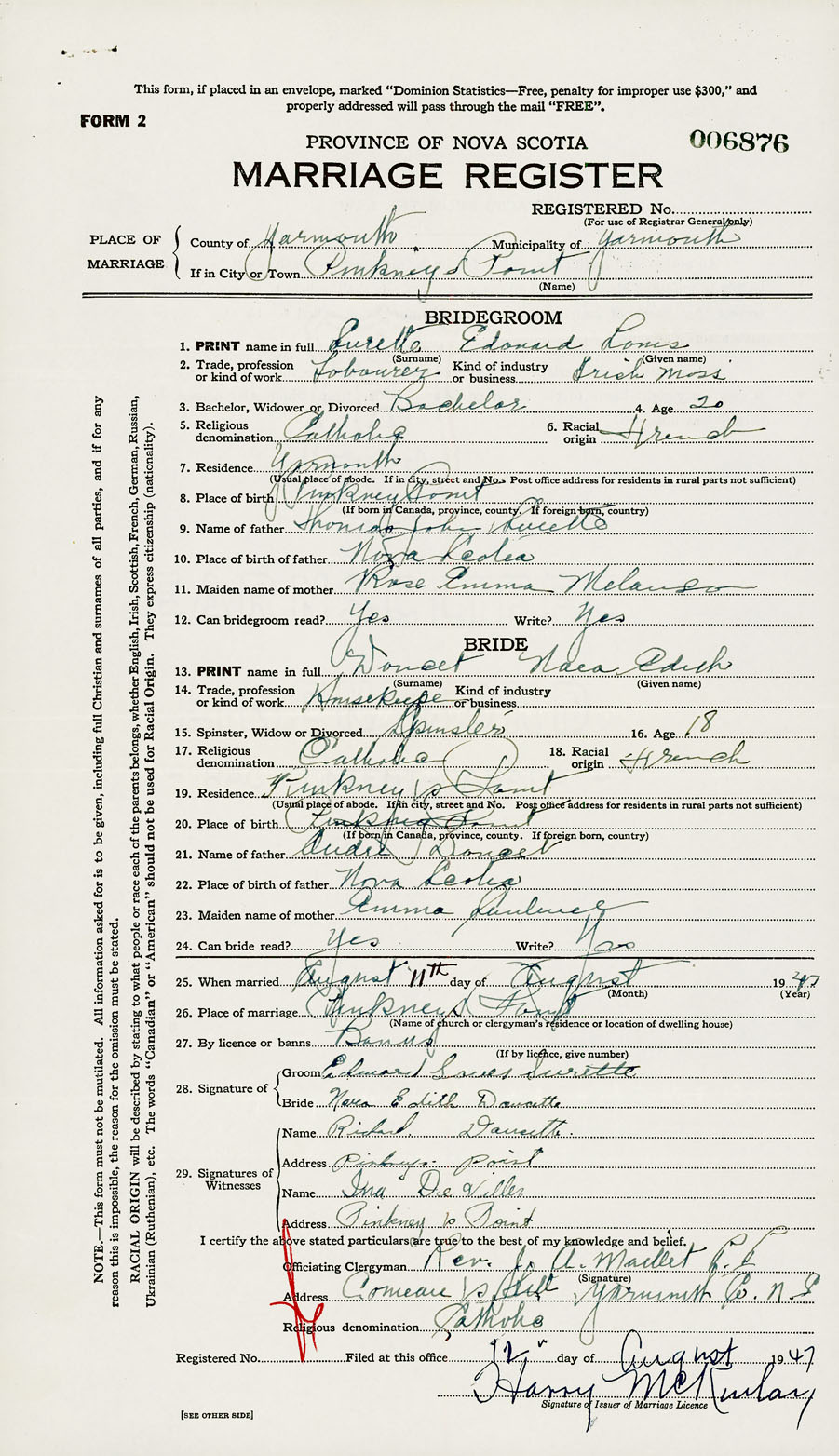 28. Date of marriage August 11 1947 29. By license or banns Banns 30. License number Banns