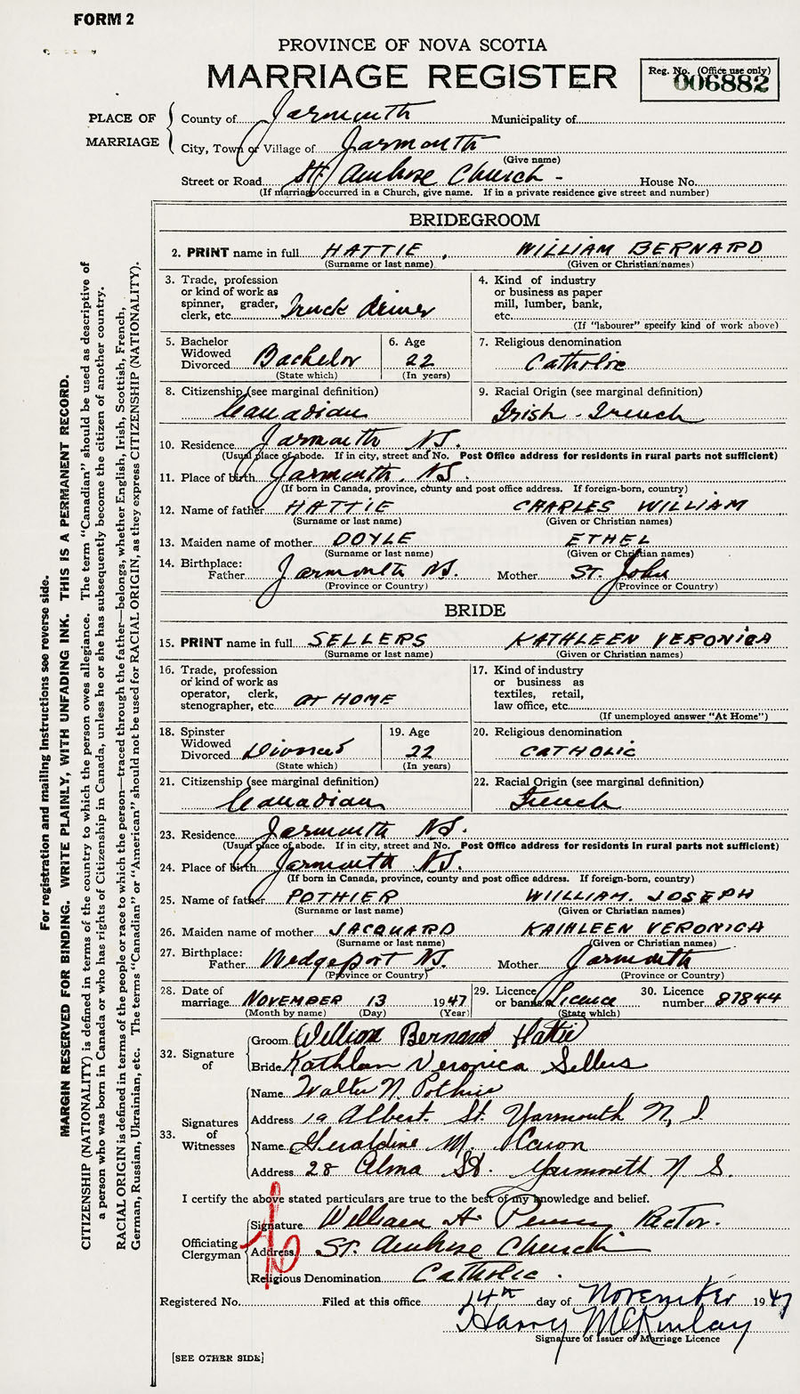 28. Date of marriage November 13 1947 29. By license or banns License 30. License number 87844