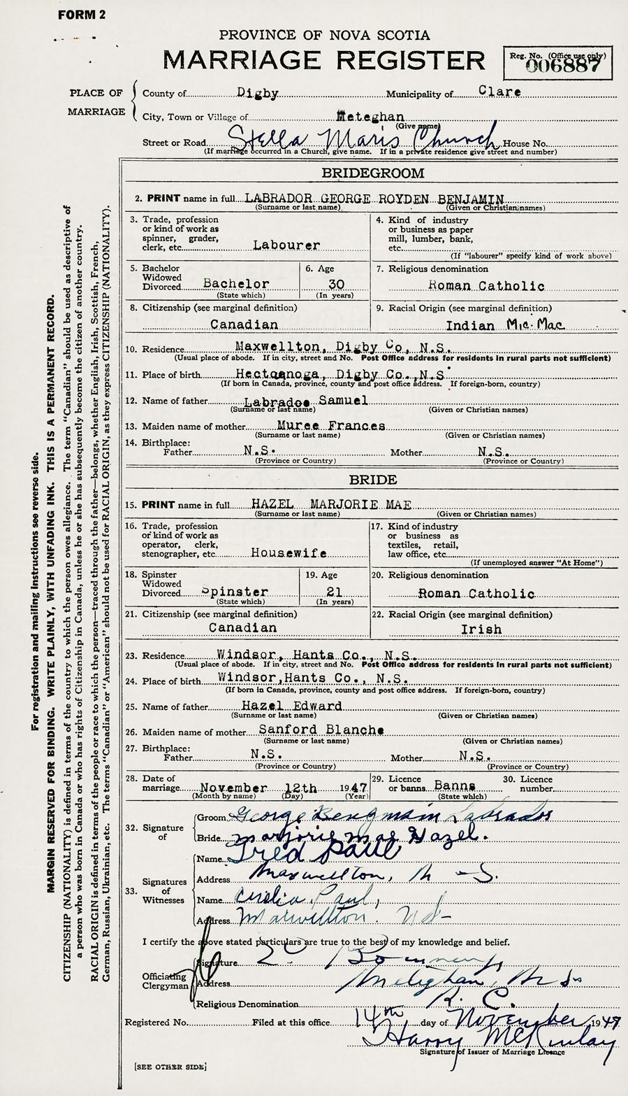 28. Date of marriage November 12 1947 29. By license or banns License 30. License number
