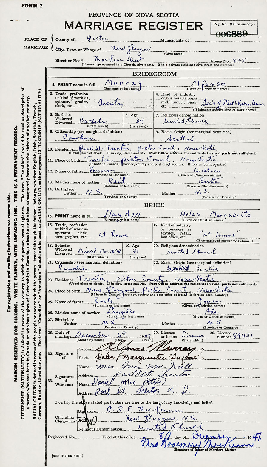 28. Date of marriage December 6 1947 29. By license or banns License 30. License number 89431