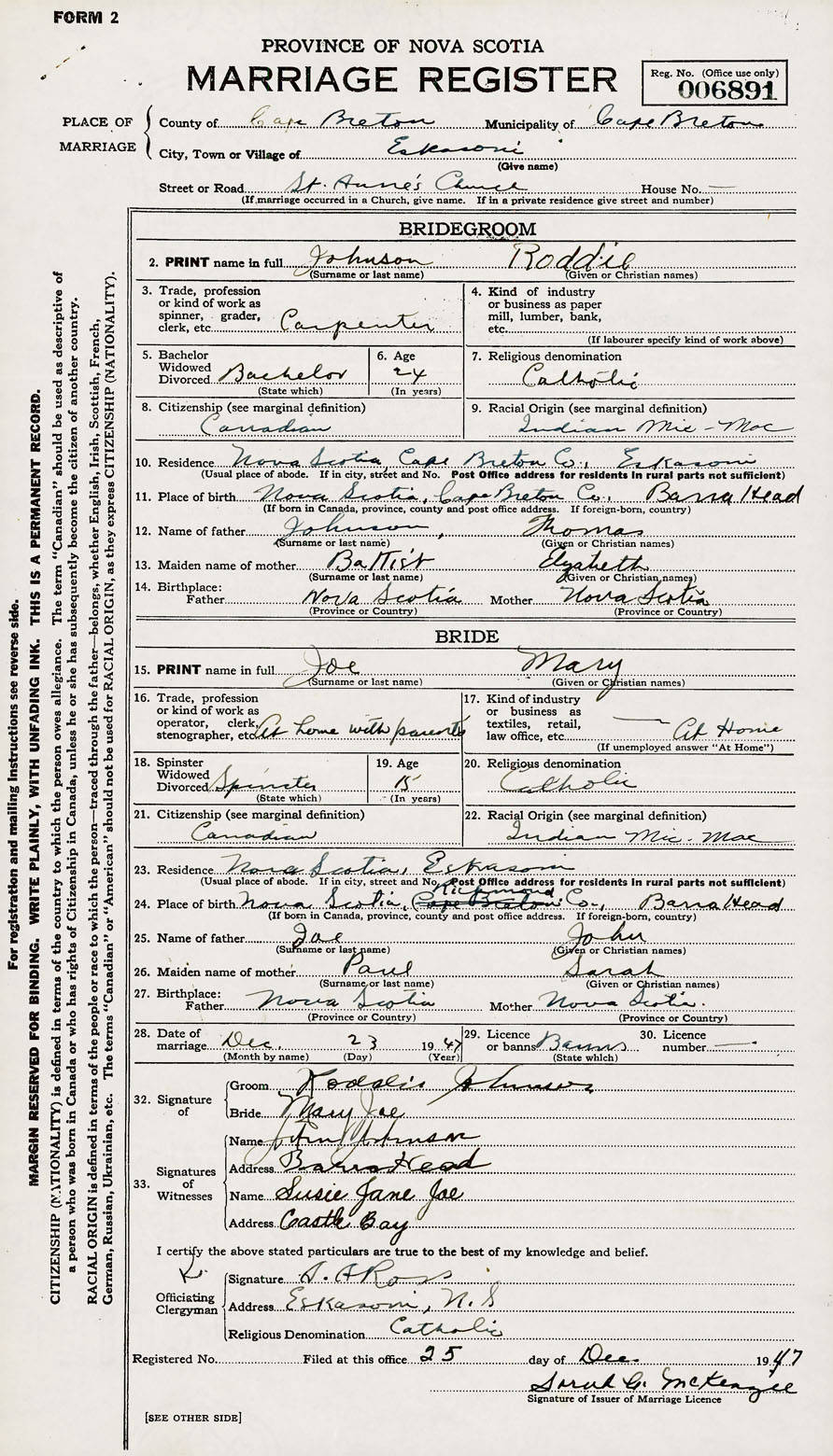 21. Citizenship Canadian 22. Racial origin Indian MicMac