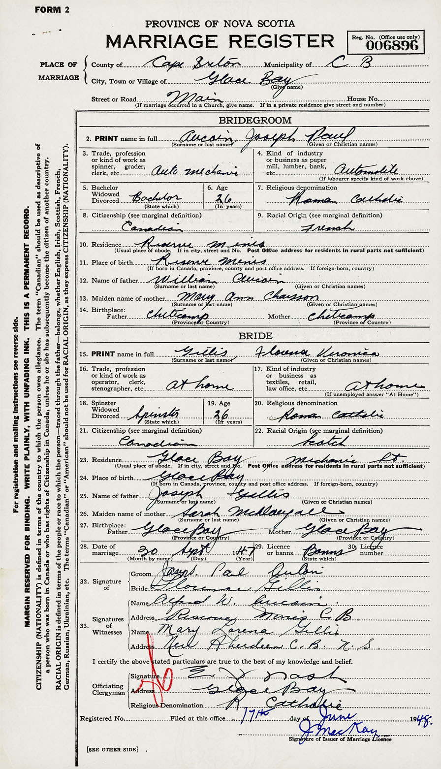27. Birthplace Father Glace Bay Mother Glace Bay