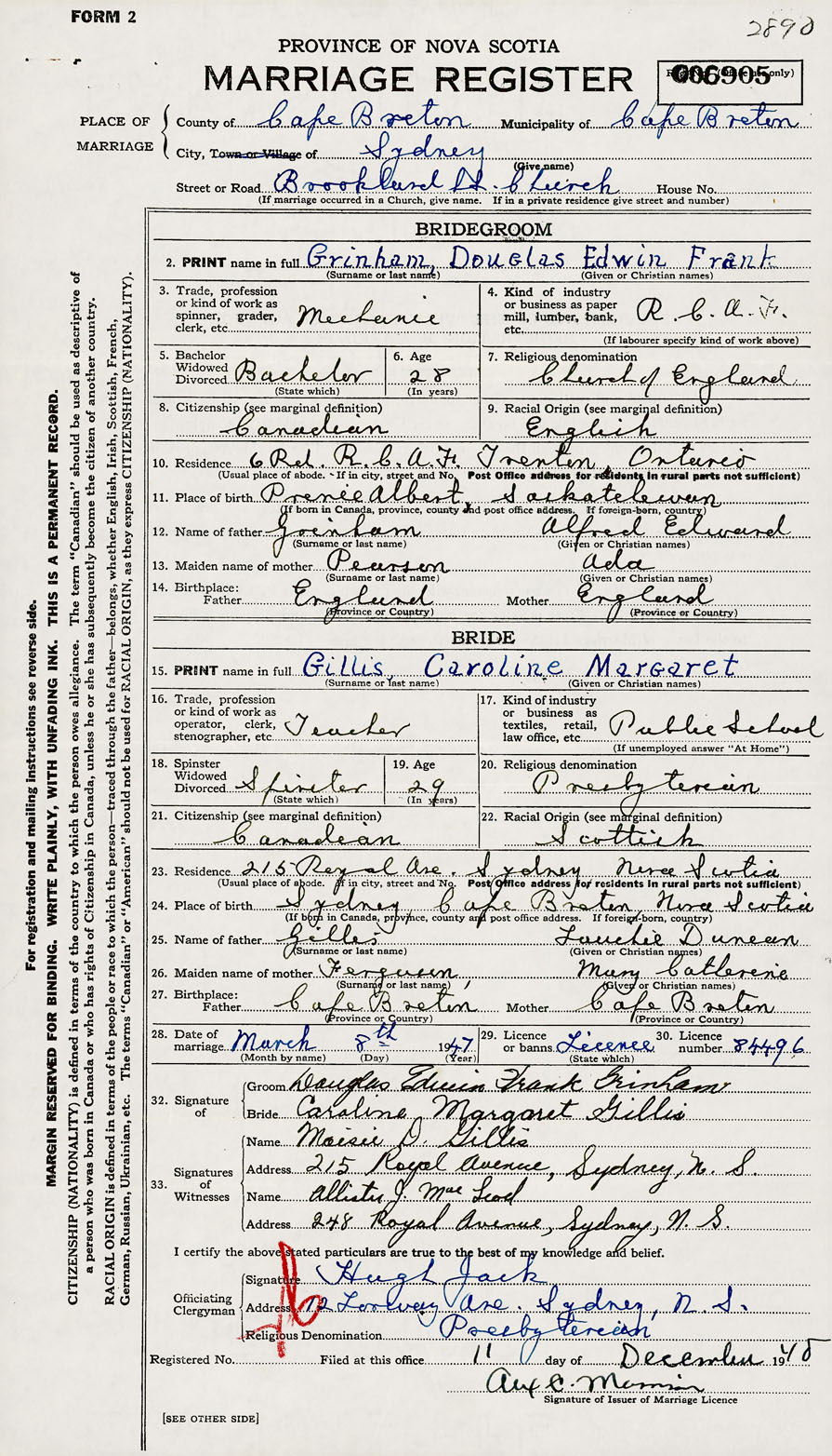 28. Date of marriage March 8 1947 29. By license or banns License 30. License number 84496
