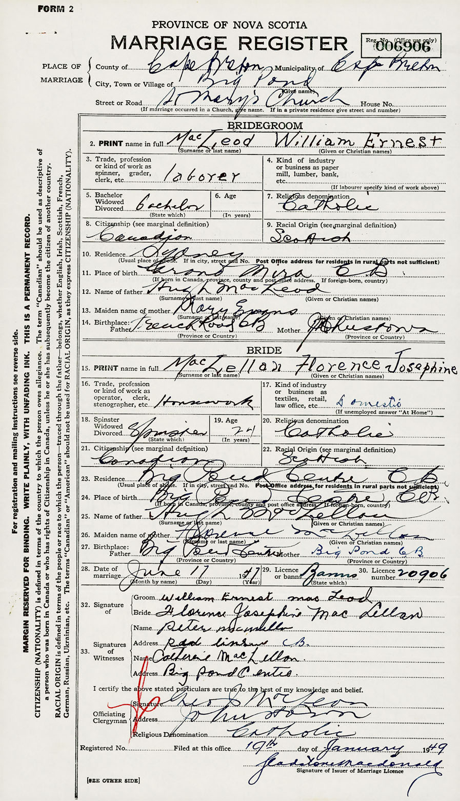 27. Birthplace Father Big Pond Centre Mother Big Pond Centre Cape Breton