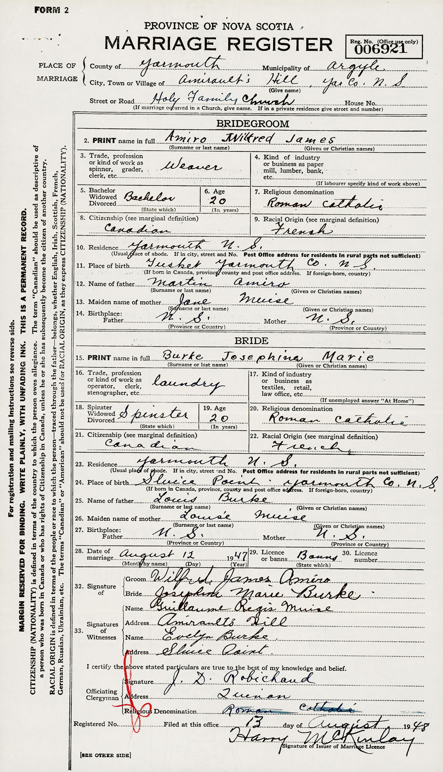 24. Place of birth Sluice Point, Yarmouth Nova Scotia