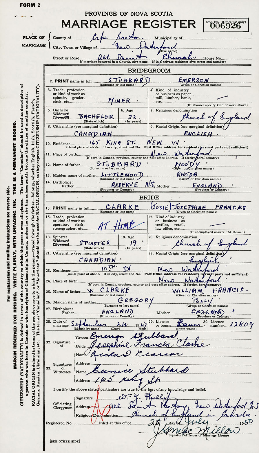 28. Date of marriage September 24 1947 29. By license or banns License 30. License number 22809