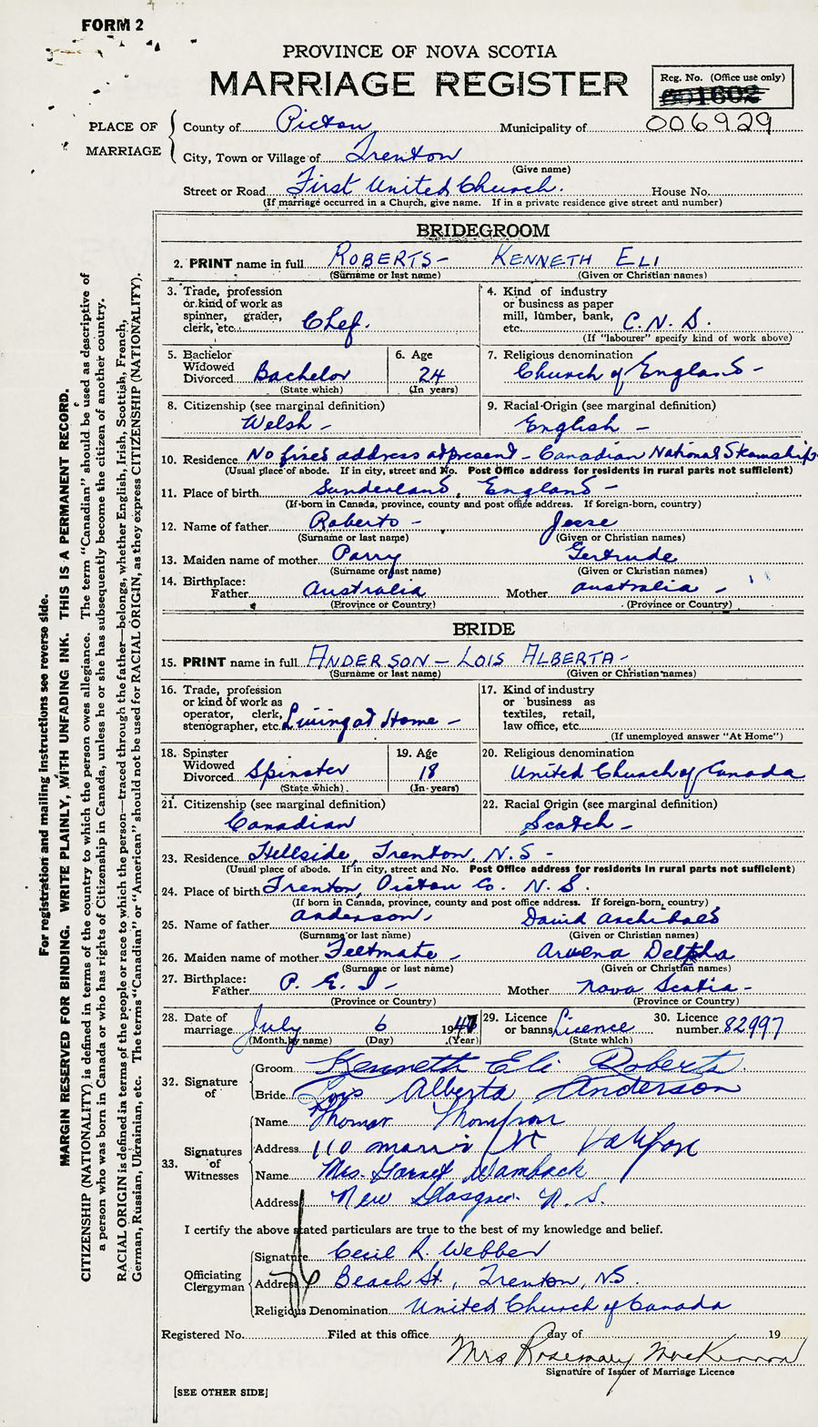 24. Place of birth Trenton, Pictou County, Nova Scotia