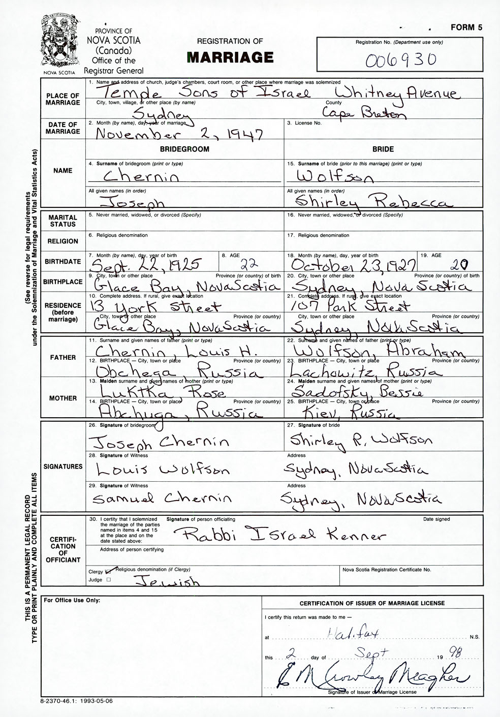 26. Place of marriage Temple Sons of Israel, Whitney Ave. Sydney, Cape Breton County