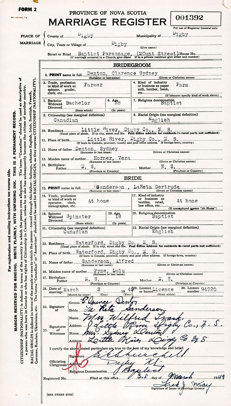 Registration: Year: 1949 number: 001392