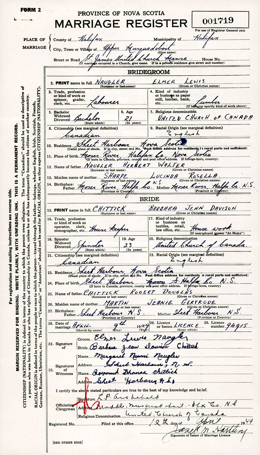 Registration: Year: 1949 number: 001719