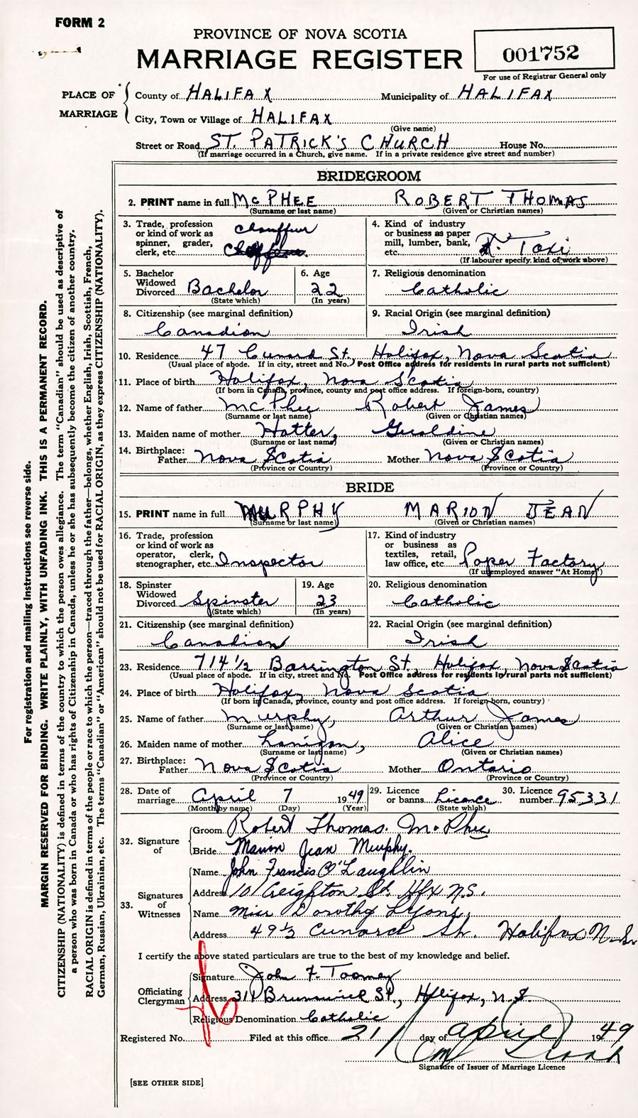 Registration: Year: 1949 number: 001752