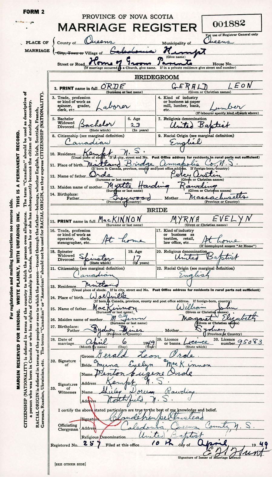 Registration: Year: 1949 number: 001882