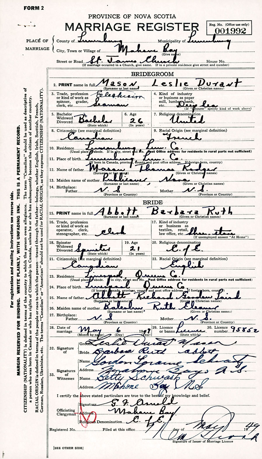 Registration: Year: 1949 number: 001992