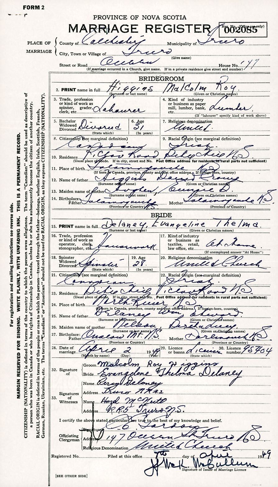 Registration: Year: 1949 number: 002085