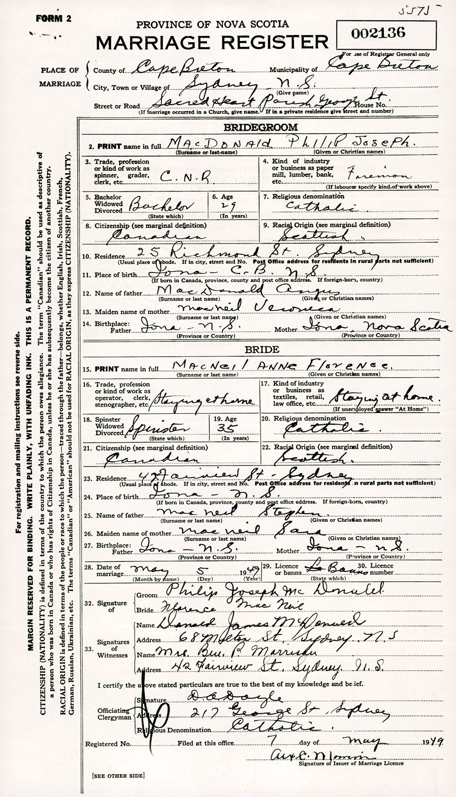 Registration: Year: 1949 number: 002136
