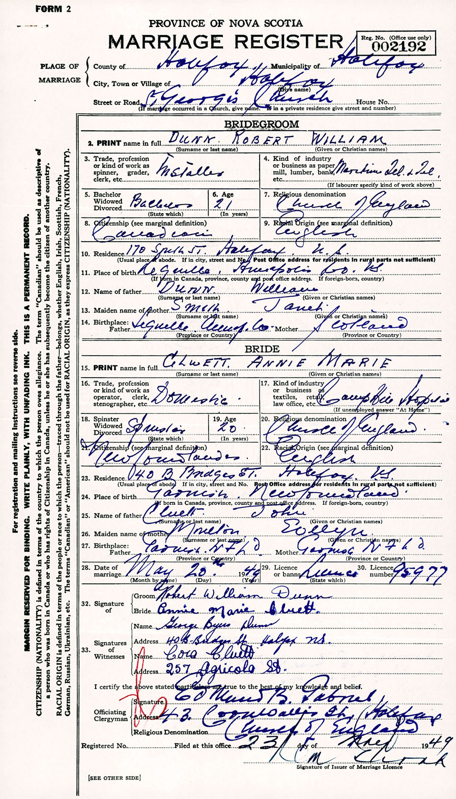 Registration: Year: 1949 number: 002192