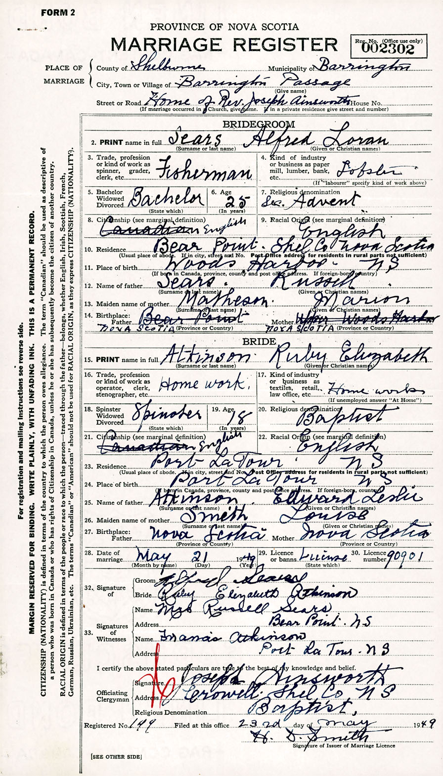 Registration: Year: 1949 number: 002302