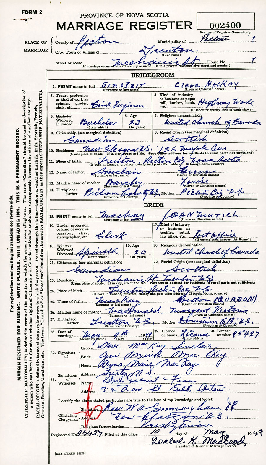 Registration: Year: 1949 number: 002400