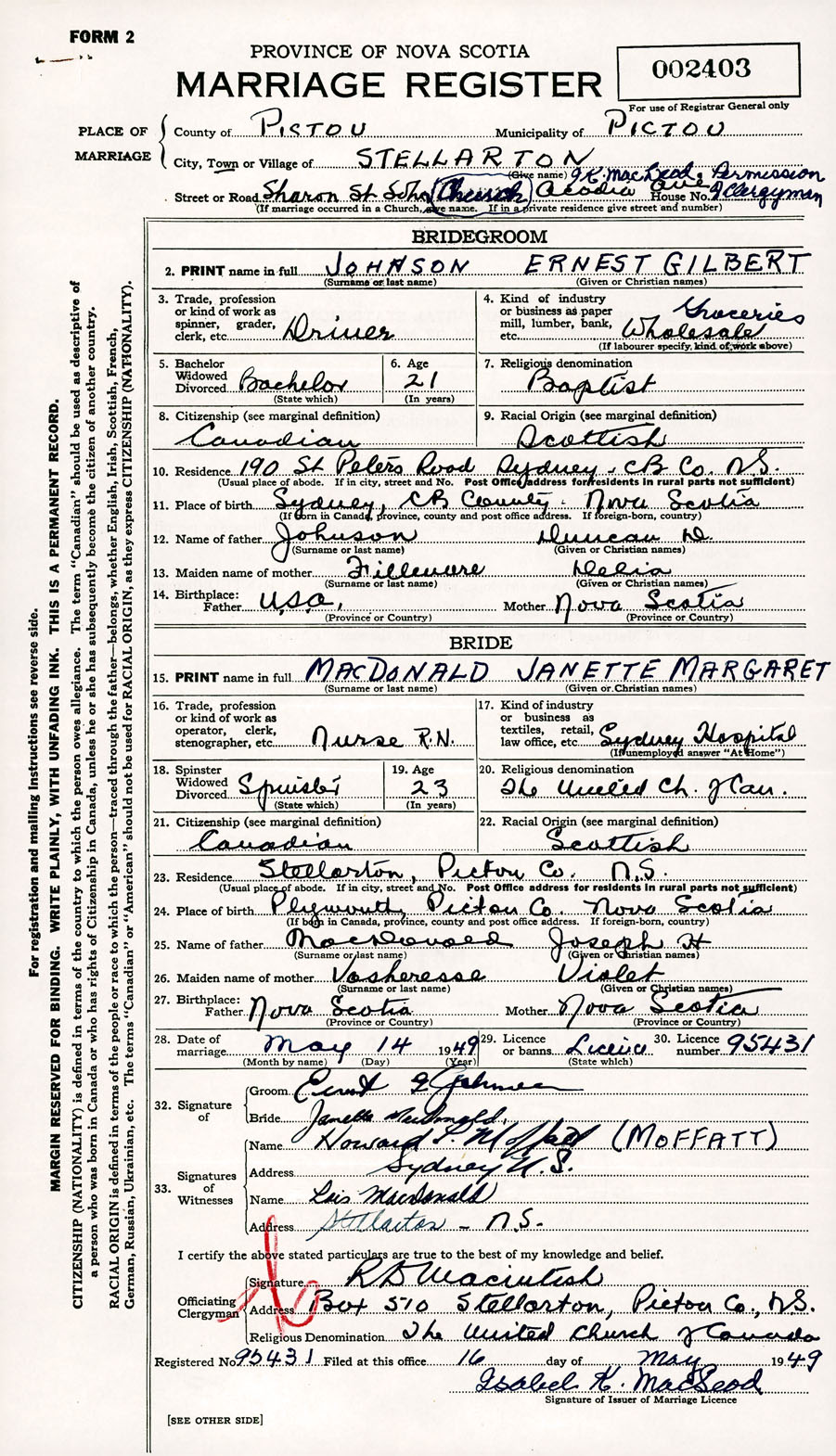 Registration: Year: 1949 number: 002403