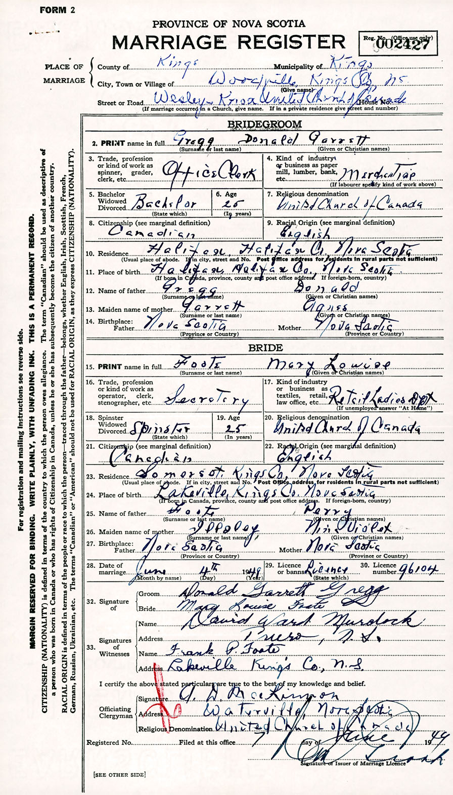 Registration: Year: 1949 number: 002427