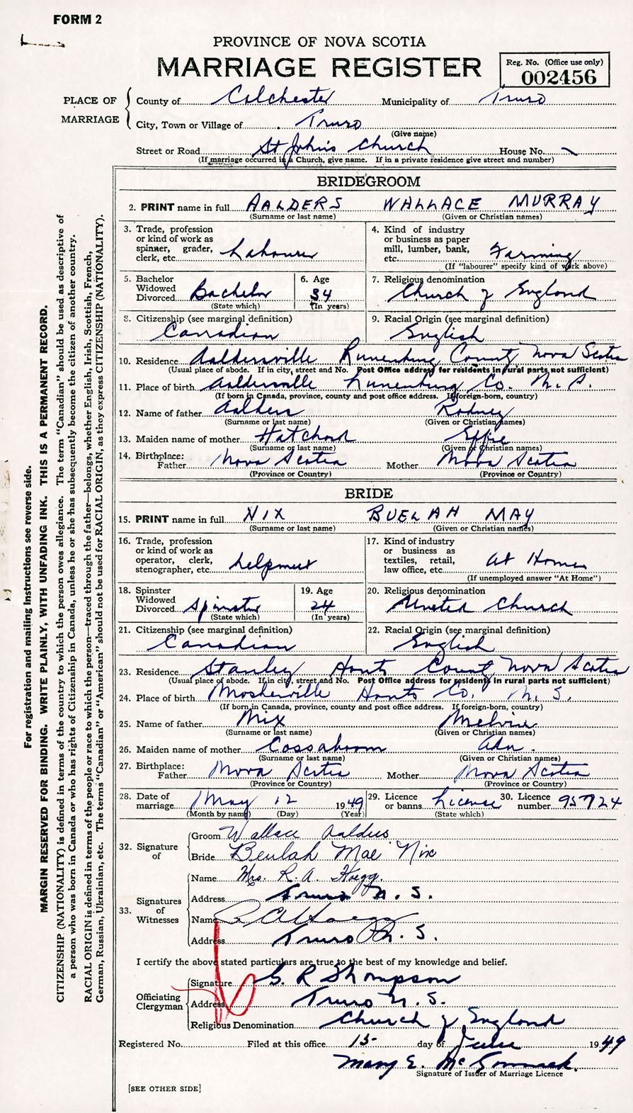 Registration: Year: 1949 number: 002456