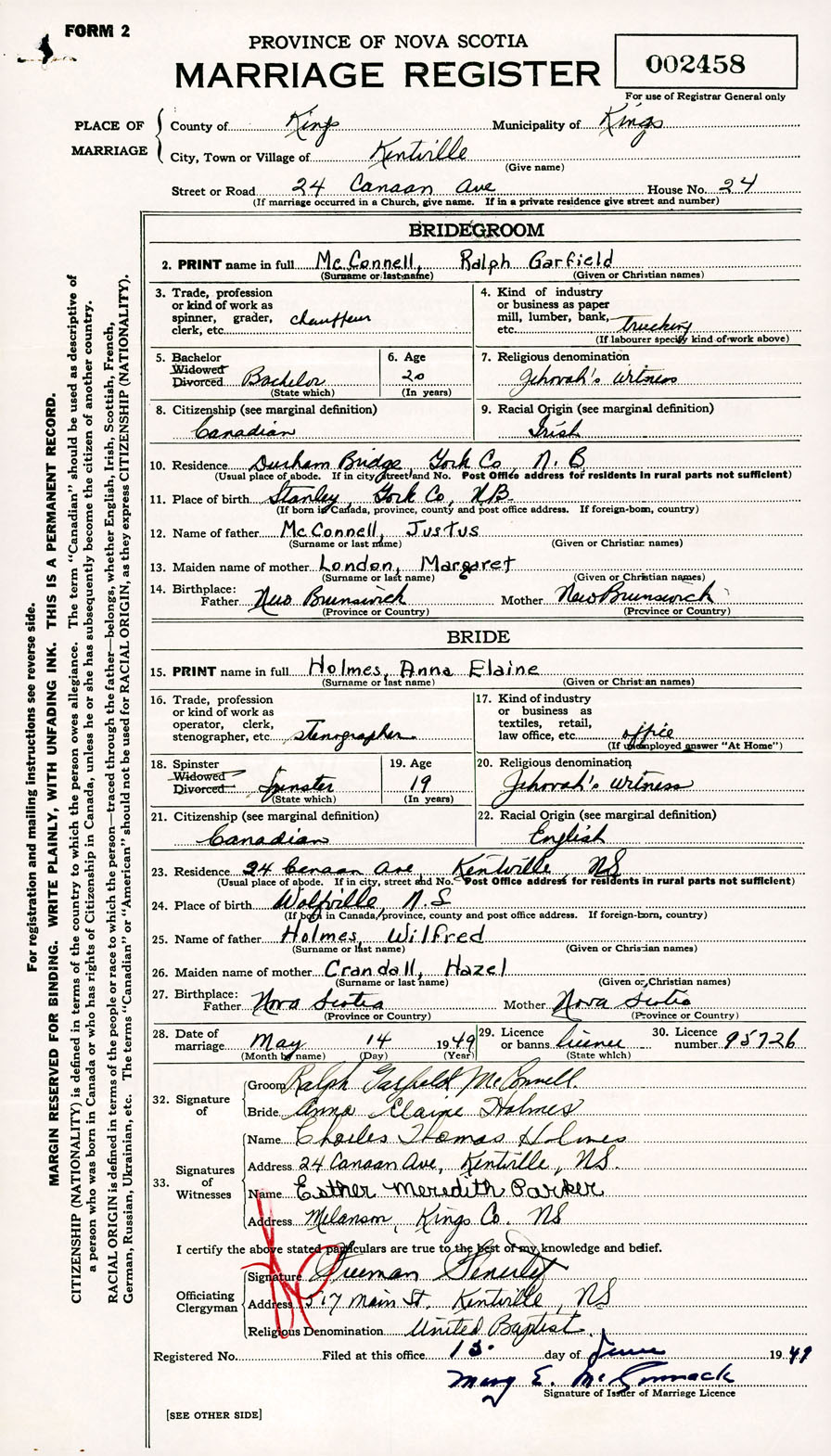 Registration: Year: 1949 number: 002458