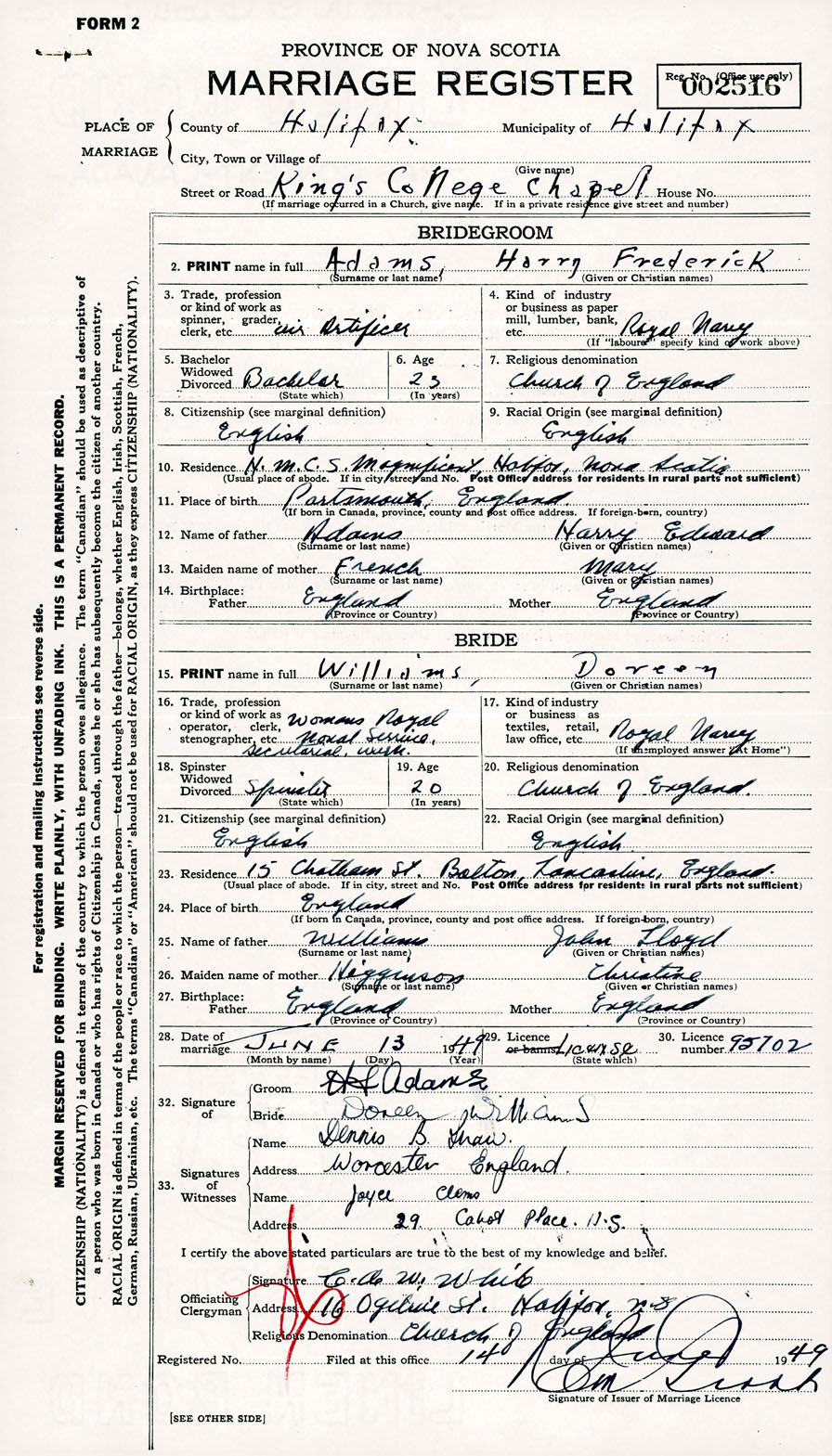 Registration: Year: 1949 number: 002516