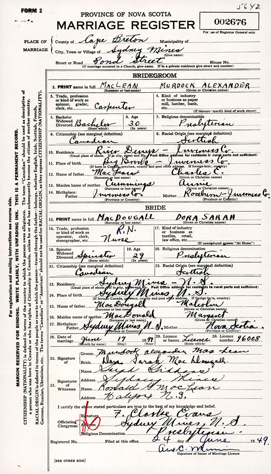 Registration: Year: 1949 number: 002676