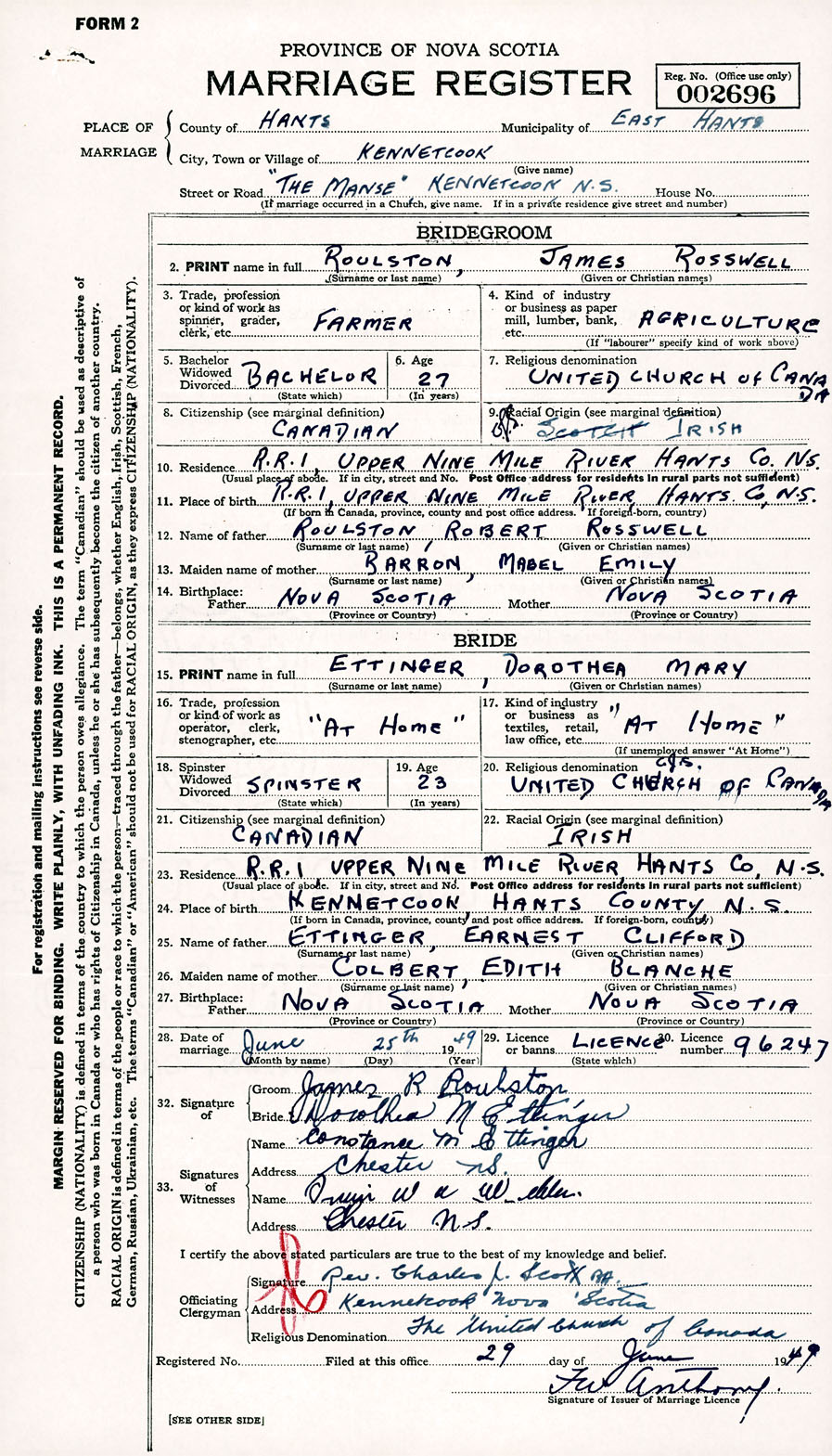 Registration: Year: 1949 number: 002696