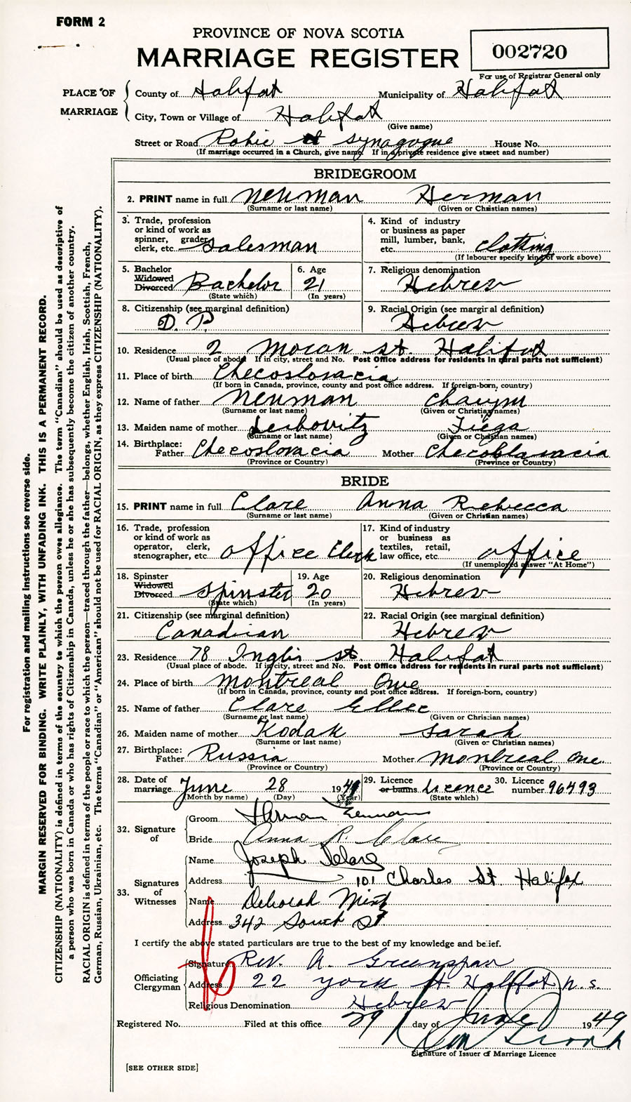 Registration: Year: 1949 number: 002720