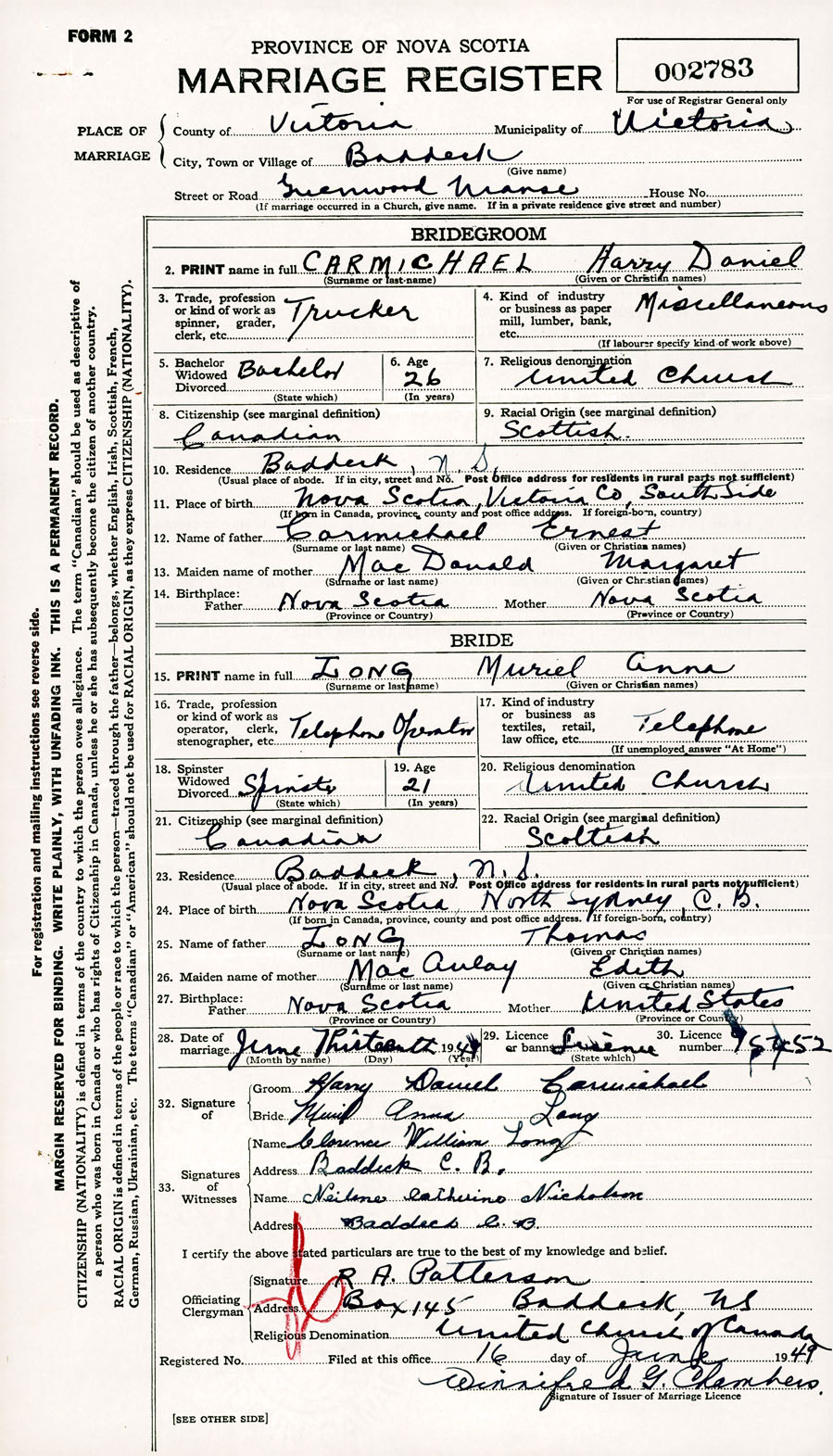 Registration: Year: 1949 number: 002783