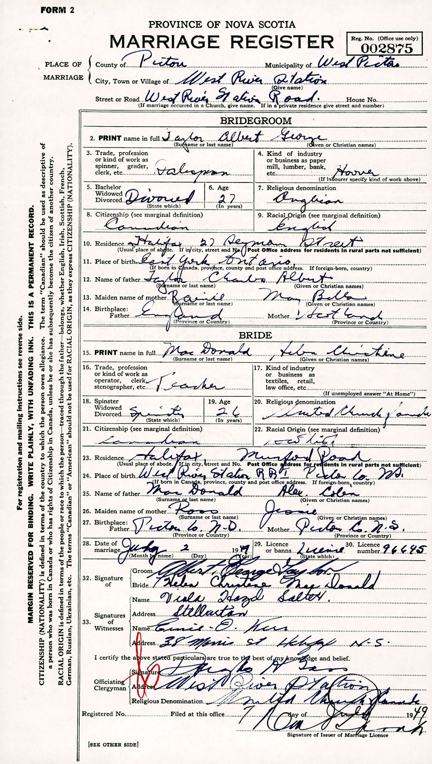 Registration: Year: 1949 number: 002875